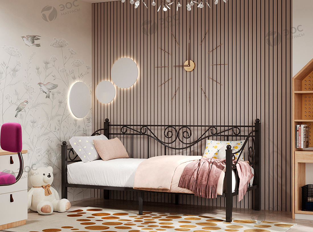 Кровать Эрика имеет форм-фактор тахты и помимо стандартных изножья и изголовья комплектуется изящной спинкой с декоративными завитками. Модель, таким образом, идеально подходит для размещения непосредственно возле стены. Кровать производится со встроенным металлическим основанием с ортопедическими ламелями. К ней отлично подойдет матрас ЭОС Тип 5а