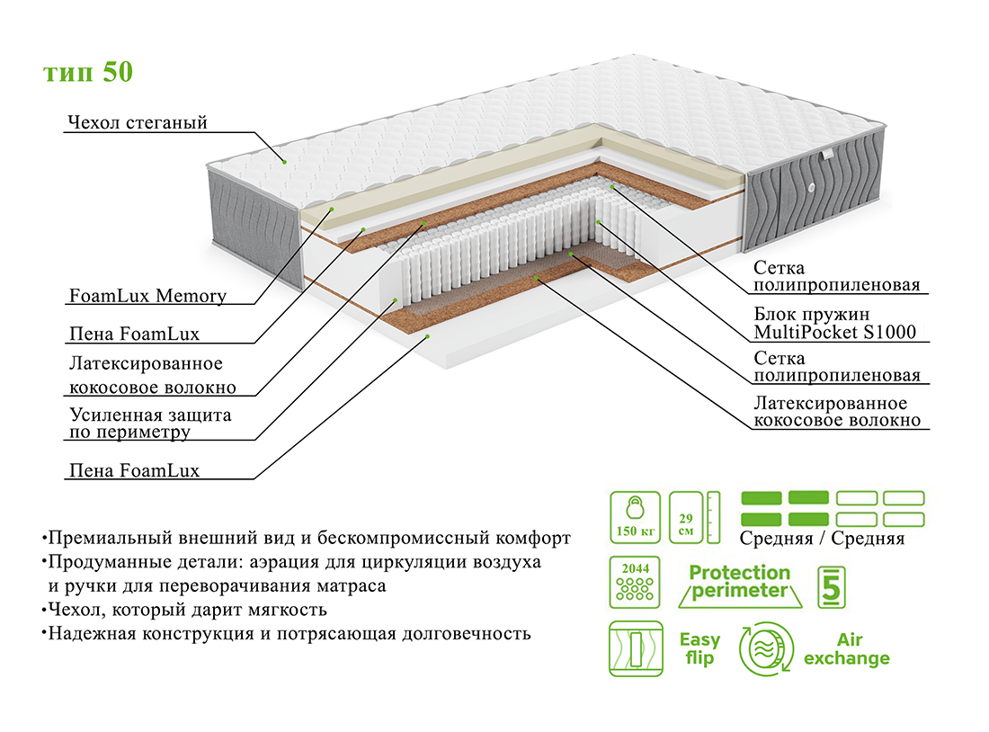 | Материалы | FoamLux (пенополиуретан), FoamLux Memory (пена с памятью формы), Латексированное кокосовое волокно, Полипропиленовая сетка |
