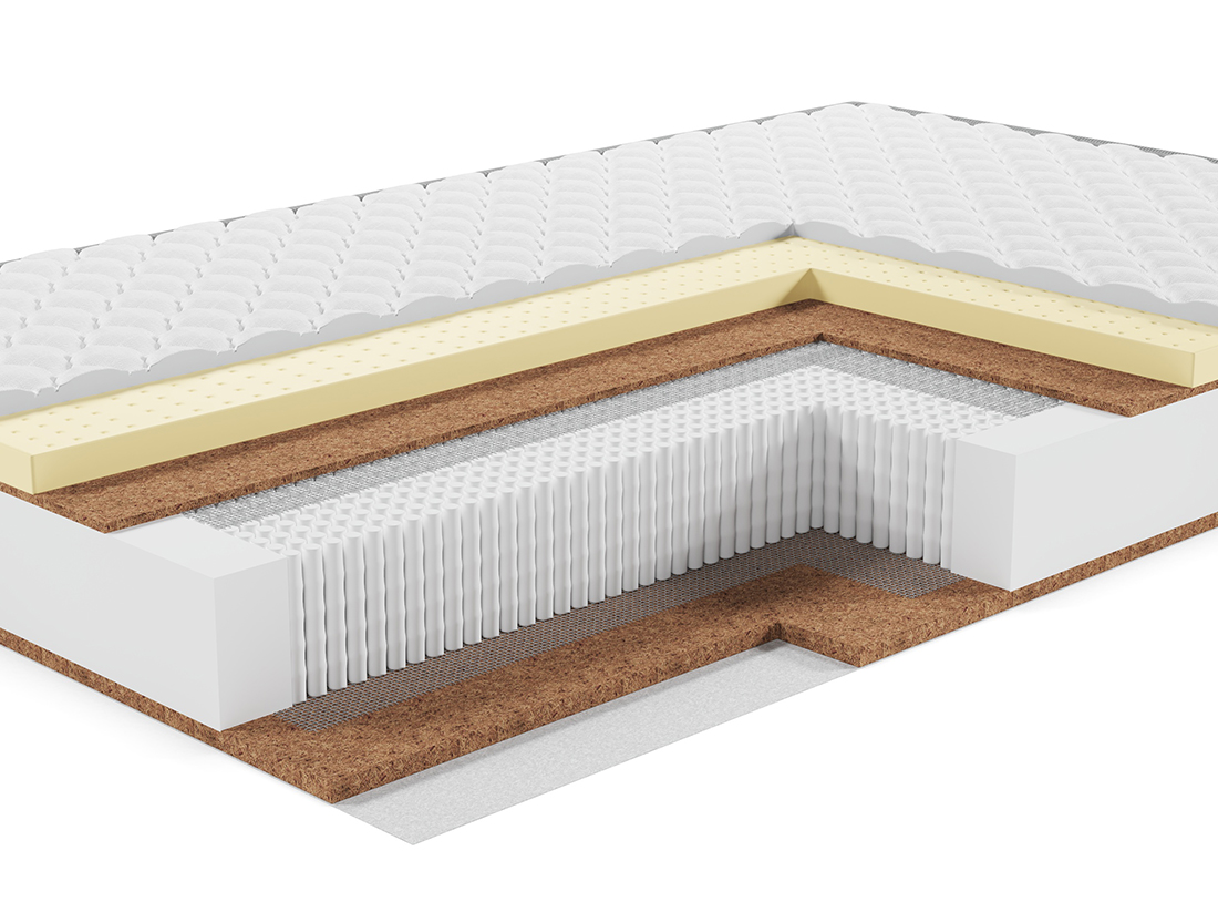- Настилочный слой из латекса и кокосовой койры. Можно переворачивать матрас, меняя степень жесткости.