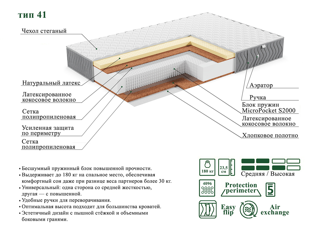 - Матрас оснащен инновационным пружинным блоком MicroPocket S2000 с 1024 пружинами на квадратный метр. Этот блок не только подстраивается под ваши контуры, но и реагирует на каждое движение, обеспечивая идеальную поддержку. С нагрузкой до 180 кг на спальное место.