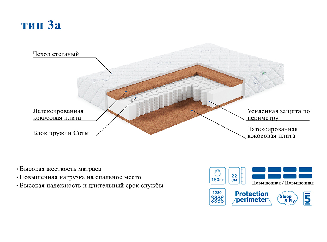 Коллекция матрасов «Премьер» отличается надёжным пружинным блоком «Соты». Количество пружин обеспечивает идеальный ортопедический эффект. В коллекции идеально сочетаются передовые технологии и натуральные материалы, чтобы каждый смог насладиться правильным спальным местом и здоровым сном. Матрас EOS Премьер 3а – это уникальное сочетание природных материалов с усиленным независимым пружинным блоком. Высокая надежность и долгий срок службы.